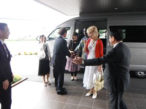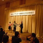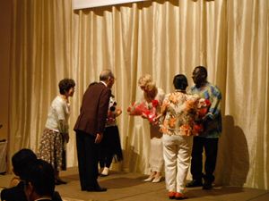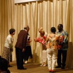 歓迎レセプションも終盤にさしかかりました。川瀬園長より帯広市社会福祉協議会、会長畑中三岐子様へ、エンプティボウルの益金の目録贈呈、そして、米国代表団よりシルバーシティ十勝おびひろへ絵画の贈呈。最後に、ご入居のお客様や施設運営の応援団の皆様より代表団の皆様へ花束が贈呈されました。終始、和やかな雰囲気で歓迎レセプションを終了することが出来ました。