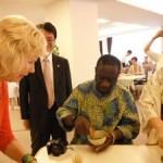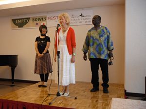 エンプティボウル(Empty Bowl 空の器)とは、スープやパンなどの簡単な食事を手作りの器で振る舞い、それを10ドルで買って手元に置いてもらい、世界の飢餓をいつも忘れないための運動です。1990年米国ミシガン州で始まった食糧難や病気に苦しむ人々を救済する事業です。帯広開催での益金は帯広市社会福祉協議会に贈呈することになります。米国からは代表団として、2011年エンプティボウル組織委員会会長キャサリン・ペイトンさん、ハンプトン大学の美術教授アンプフ・アンティさん、米国陶芸家協会会員、陶芸家、たなかあきこさんが来日されました。