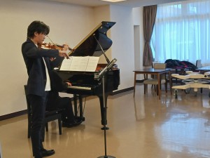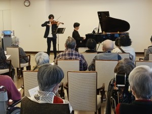 和光さん(バイオリン)、長尾さん(ピアノ)は、音楽大学卒業後、様々な演奏経験を経て、現在は、ともに地元企業のレジデンスアーティスト(滞在芸術家)として、帯広市や十勝管内で音楽活動を展開されており、今回は、ご入居者様からのご紹介により、演奏会が実現しました。